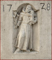 mit Kind und die Jahreszahl 1728 – und auch Teile einer Inschrift am Sockel gegen Norden: